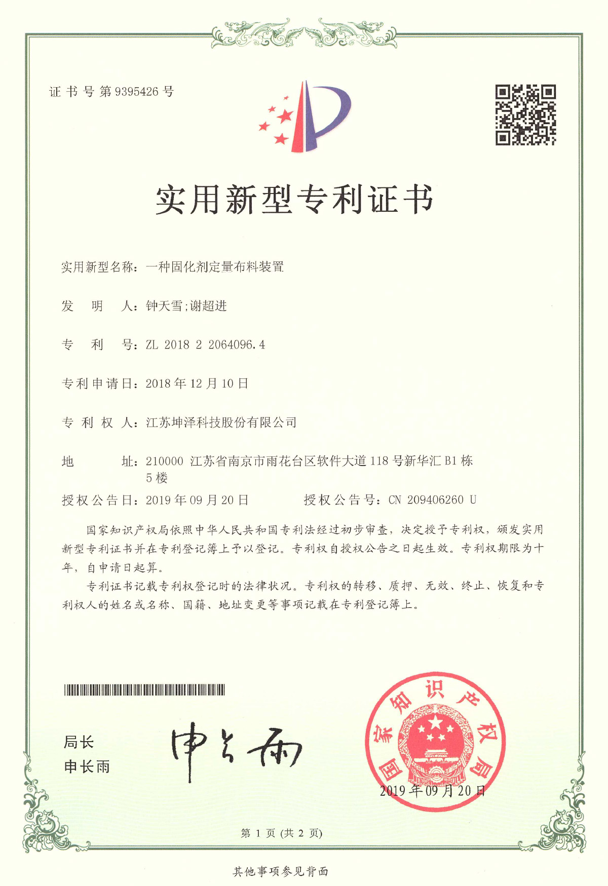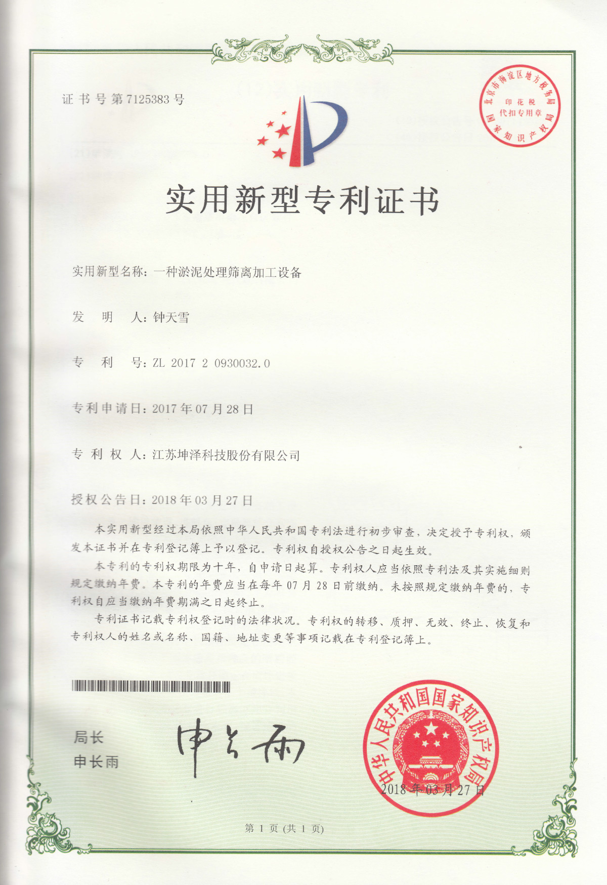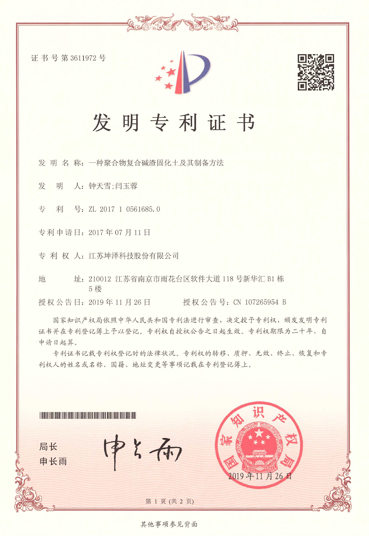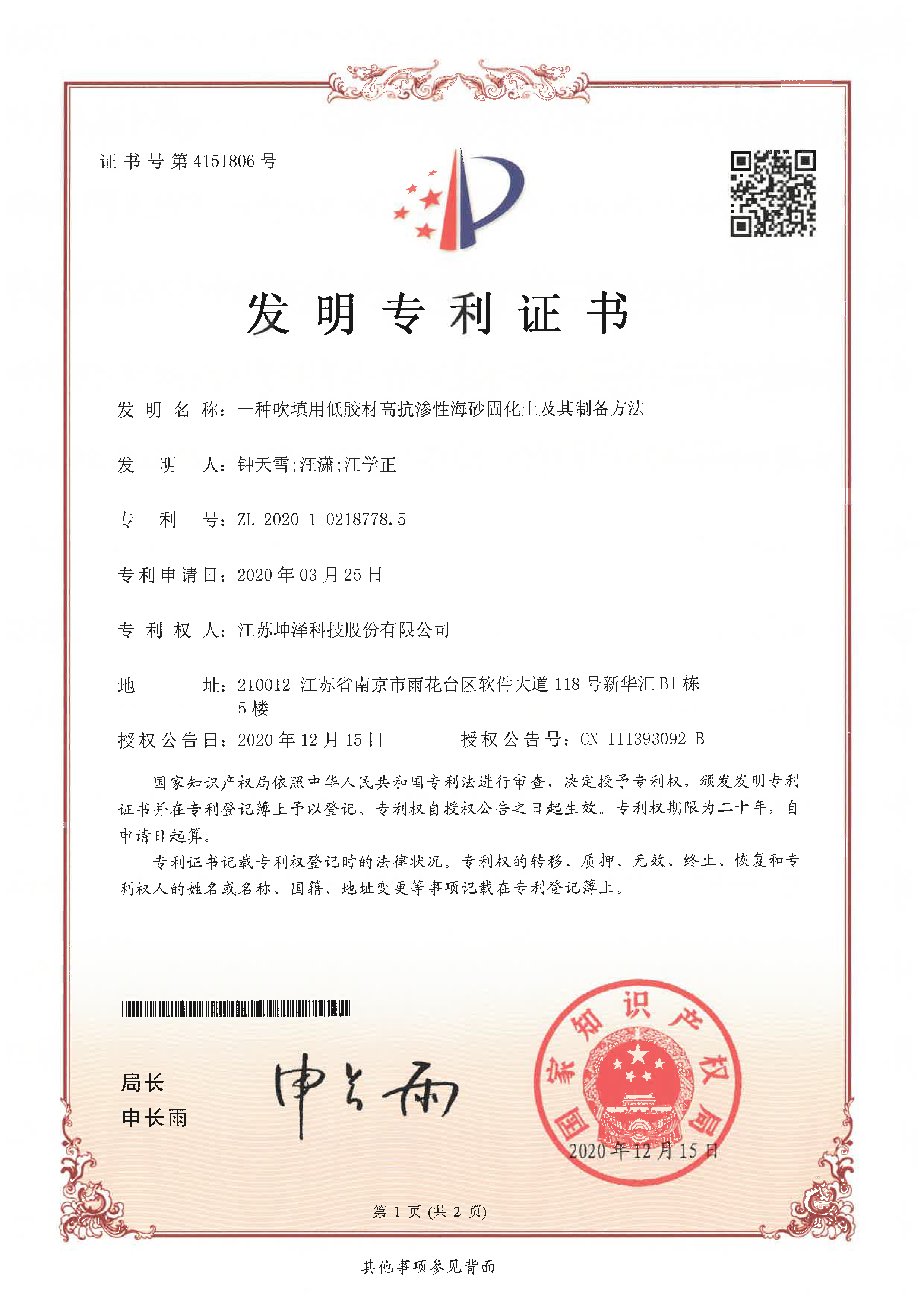 公司设有“南京(坤泽)淤泥资源化及产业化工程技术研究中心”和“连云港(坤泽)淤泥软基固化工程技术研究中心”,拥有多项专利,覆盖了固化剂、固化土产品以及施工工艺及专有生产和施工设备。