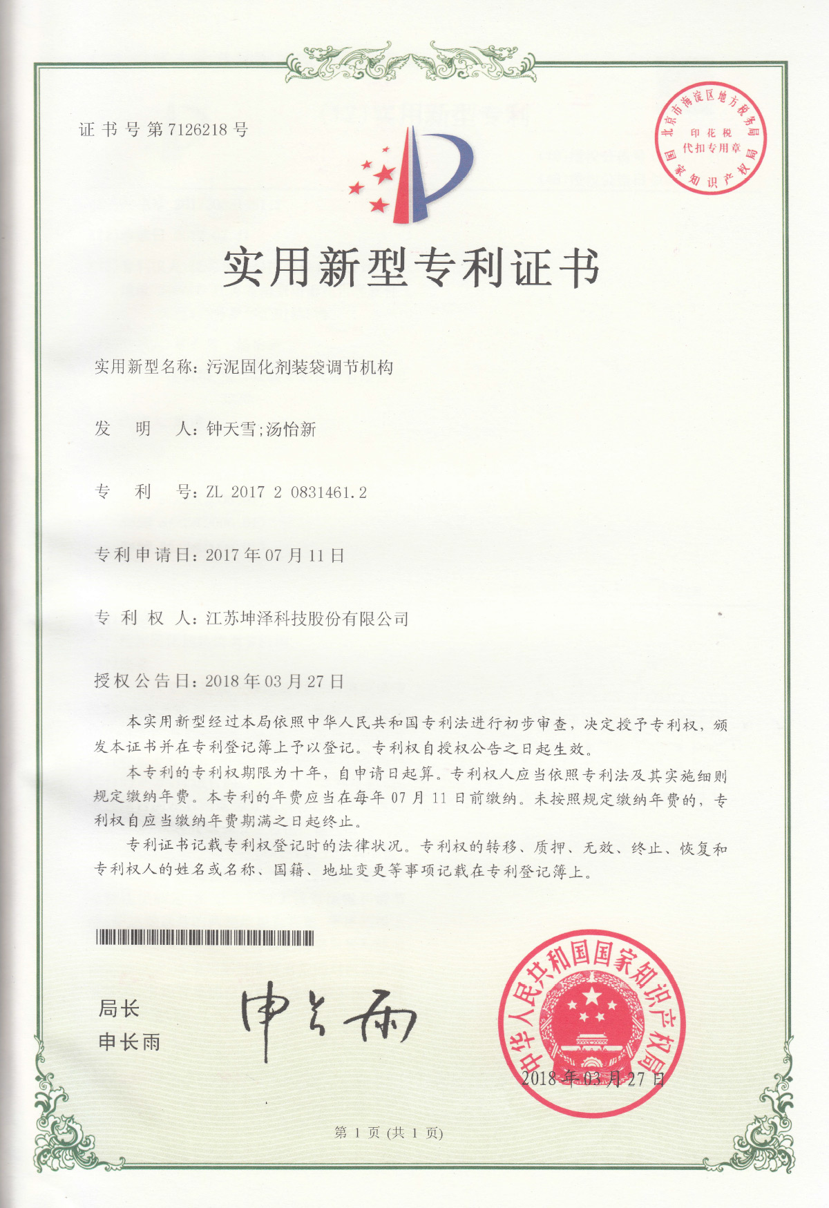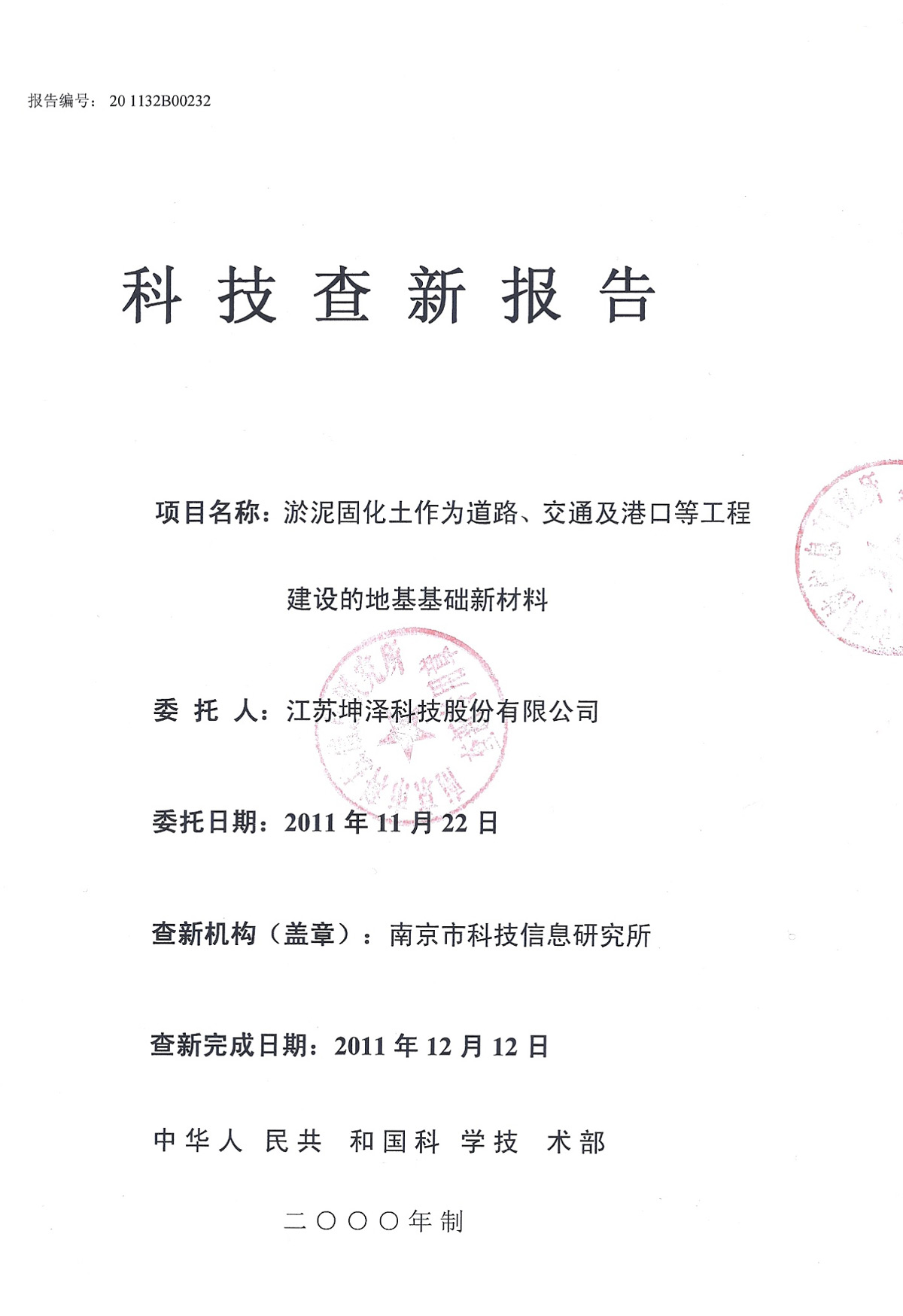 通过国家标准化机构的审核备案,建立了淤泥固化土产品的企业标准,【Q/320114 JSKZ 001-2011《坤泽®系列淤泥固化土》企业标准】(最新修订版本为Q/320114 JSKZ 001-2018《坤泽®系列淤泥固化土》),参编了《固化土道路应用技术规程》行业标准。